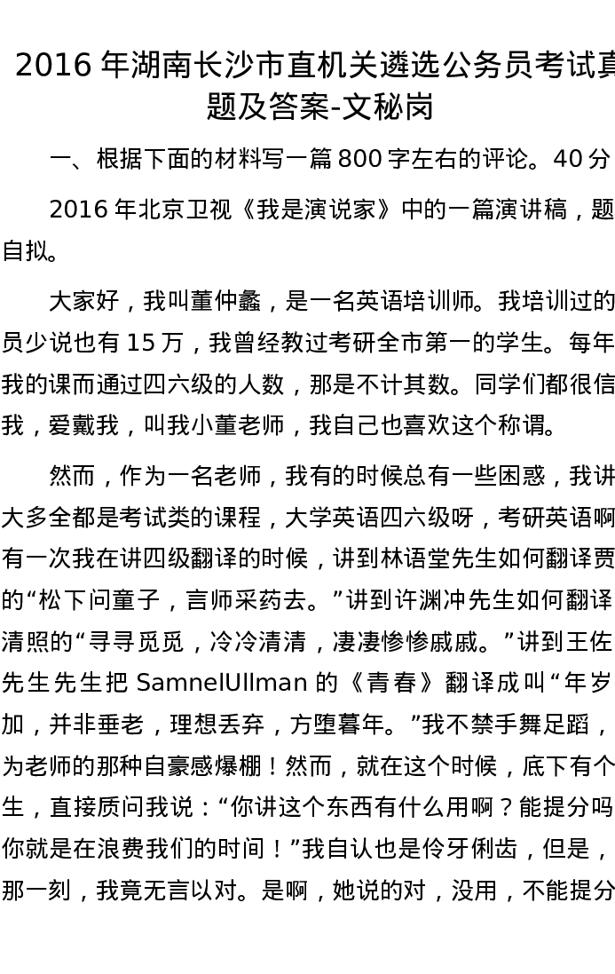 2016年湖南长沙市直机关遴选公务员考试真题及答案-文秘岗
