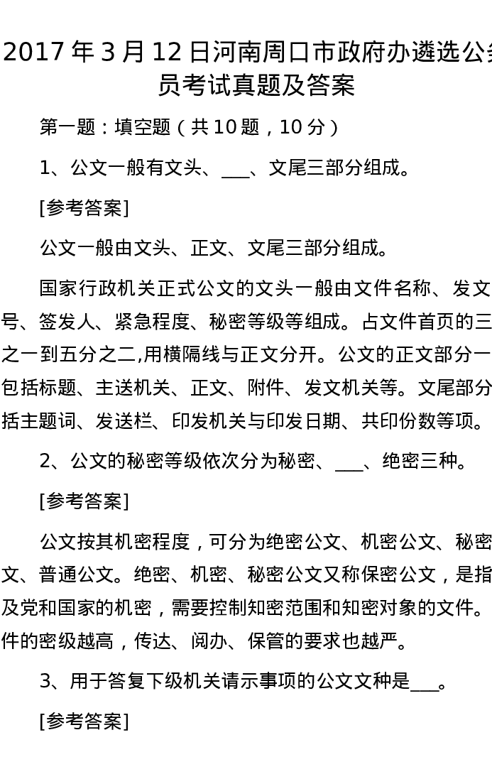 2017年3月12日河南周口市政府办遴选公务员考试真题及答案