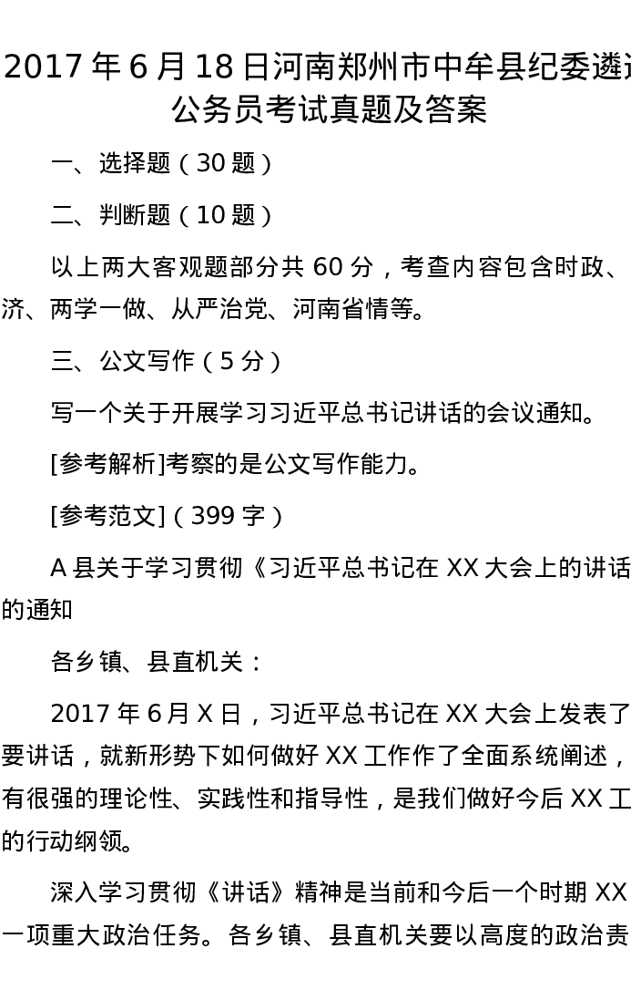 2017年6月18日河南郑州市中牟县纪委遴选公务员考试真题及答案