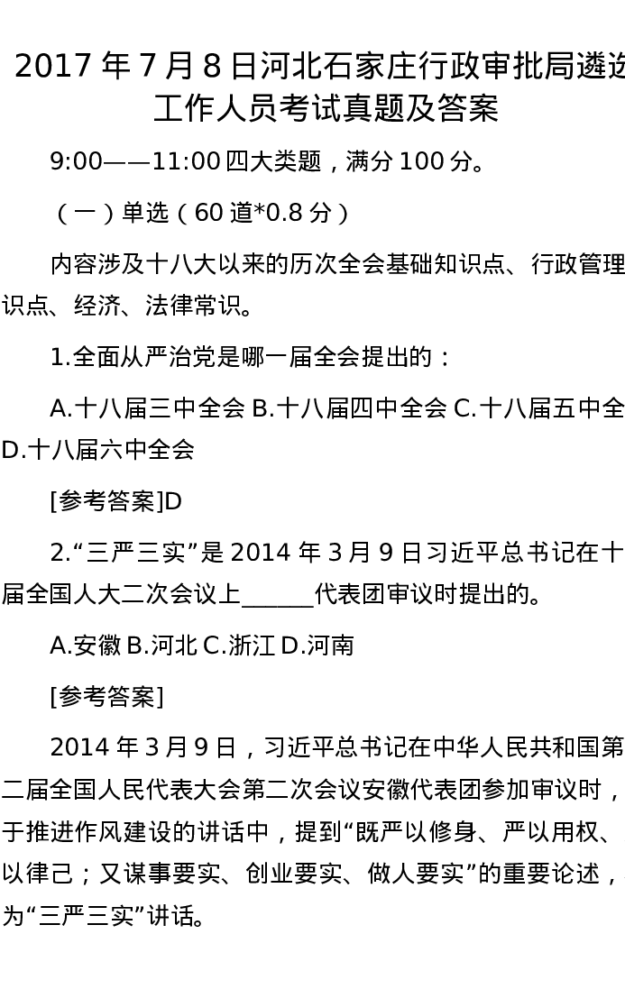 2017年7月8日河北石家庄行政审批局遴选工作人员考试真题及答案