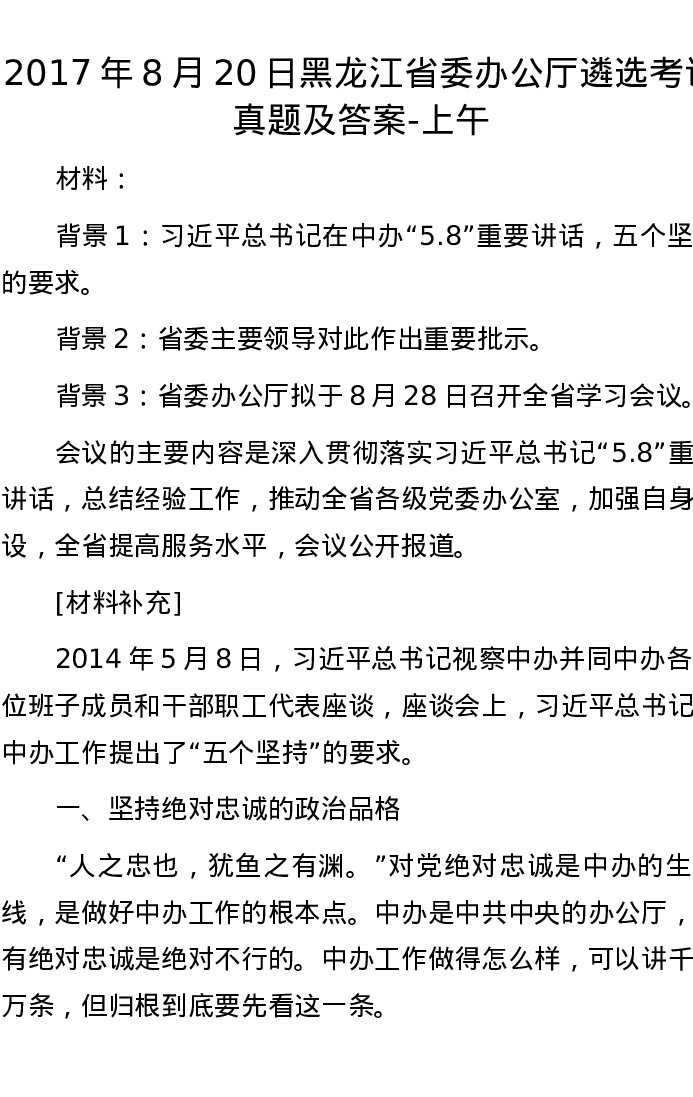 2017年8月20日黑龙江省委办公厅遴选考试真题及答案-上午