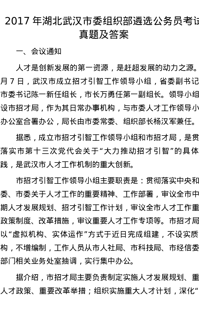 2017年湖北武汉市委组织部遴选公务员考试真题及答案