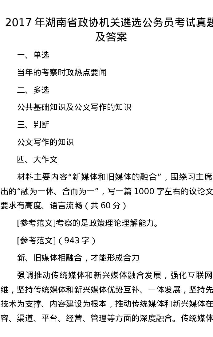 2017年湖南省政协机关遴选公务员考试真题及答案