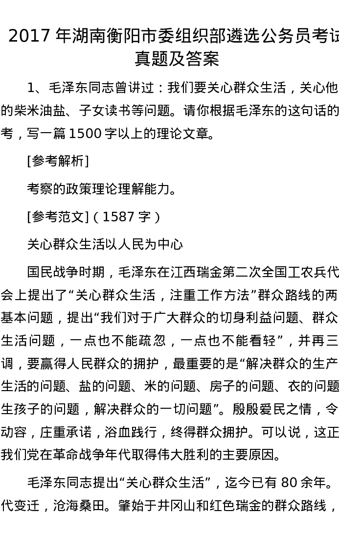 2017年湖南衡阳市委组织部遴选公务员考试真题及答案