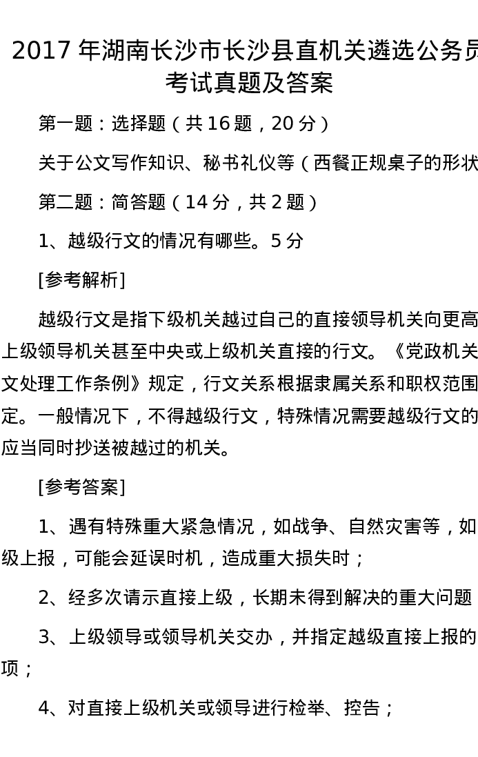2017年湖南长沙市长沙县直机关遴选公务员考试真题及答案