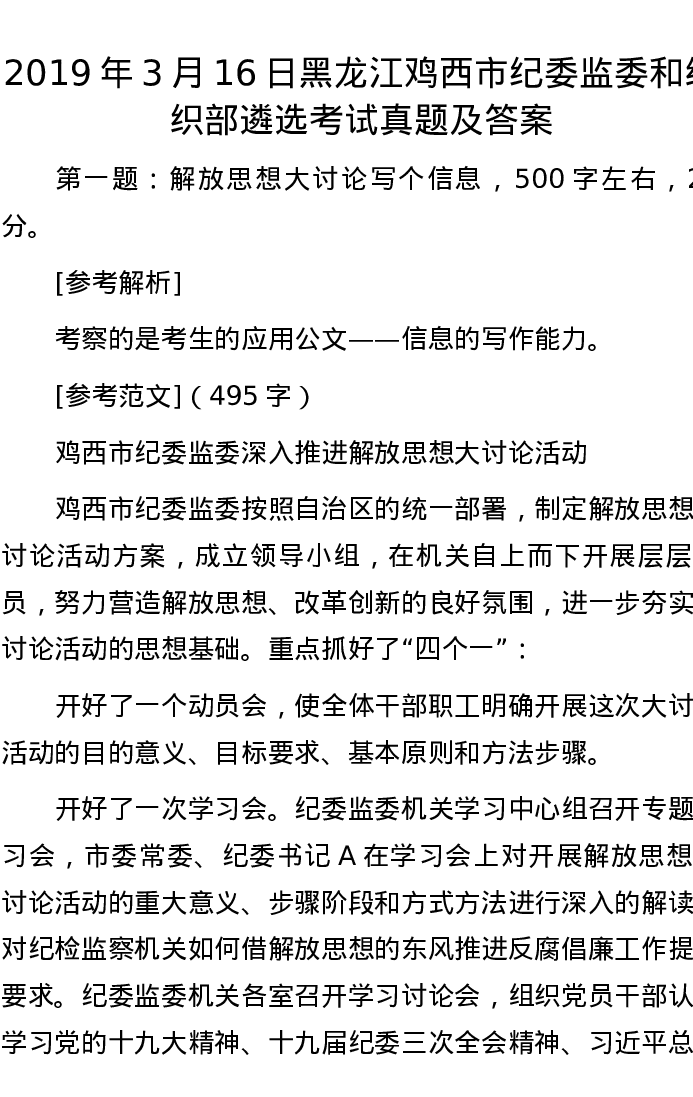 2019年3月16日黑龙江鸡西市纪委监委和组织部遴选考试真题及答案