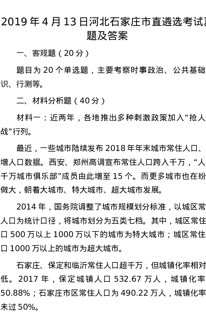 2019年4月13日河北石家庄市直遴选考试真题及答案