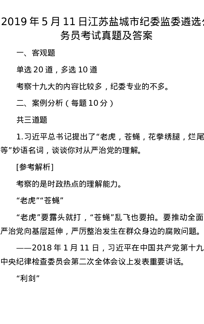 2019年5月11日江苏盐城市纪委监委遴选公务员考试真题及答案