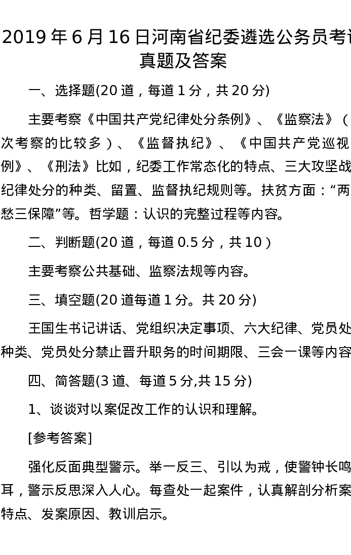 2019年6月16日河南省纪委遴选公务员考试真题及答案