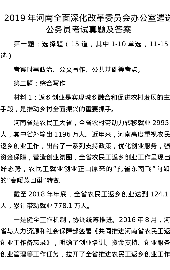 2019年河南全面深化改革委员会办公室遴选公务员考试真题及答案