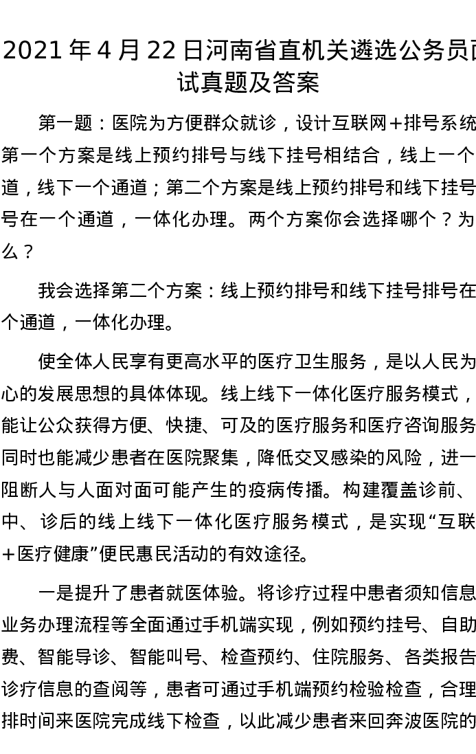 2021年4月22日河南省直机关遴选公务员面试真题及答案