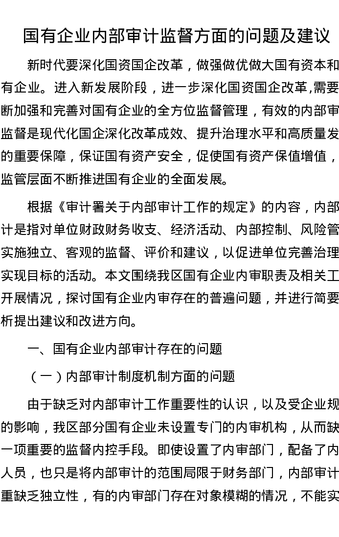 国有企业内部审计监督方面的问题及建议