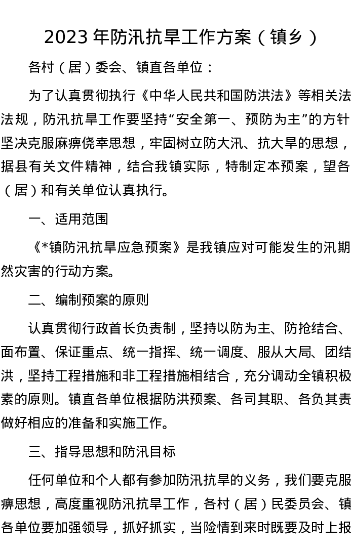 2023年防汛抗旱工作方案(镇乡)