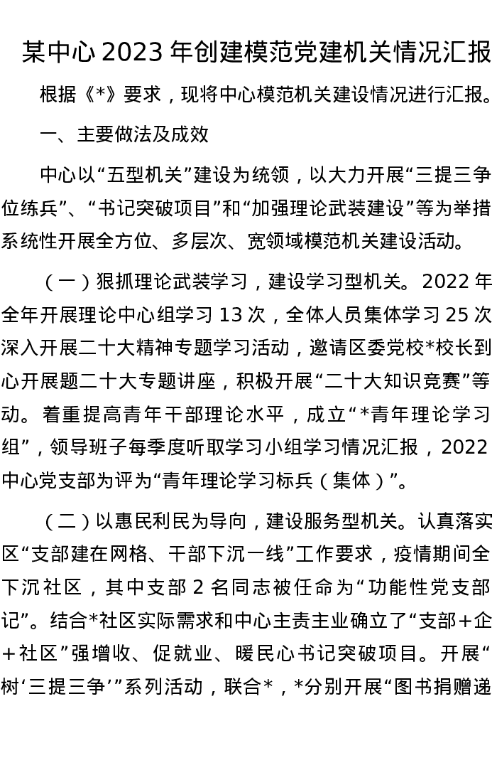 某中心2023年创建模范党建机关情况汇报