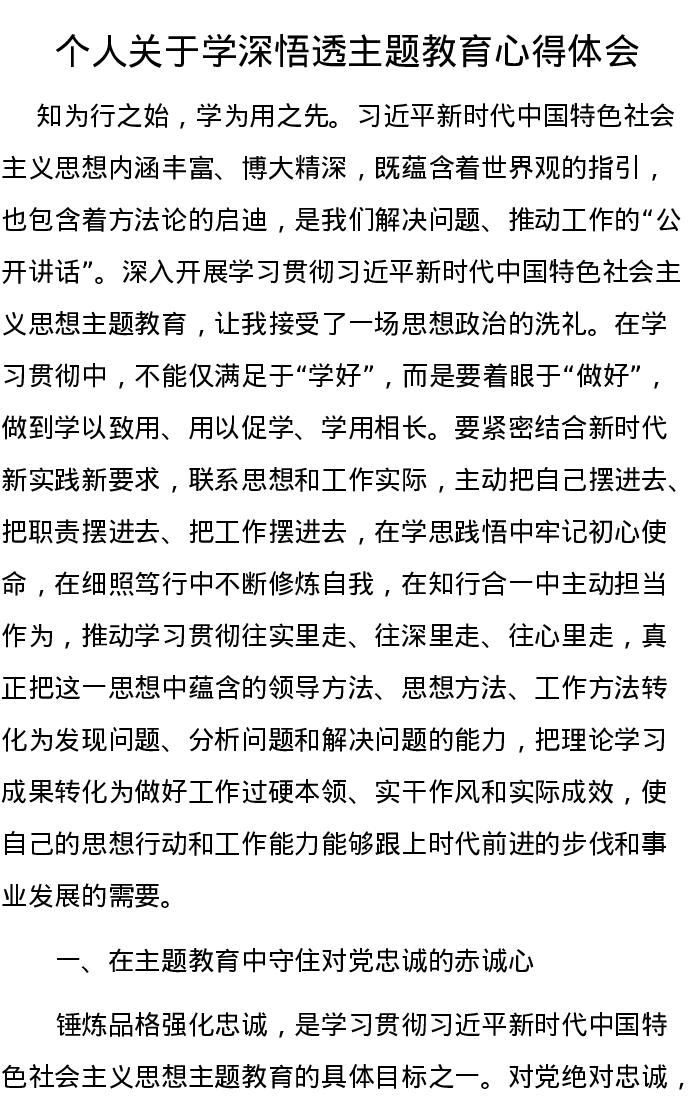 个人关于学深悟透主题教育心得体会(特色社会主义思想)