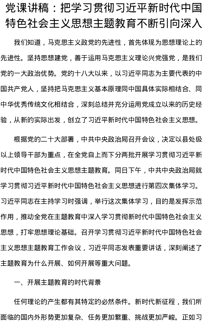 党课讲稿:把学习贯彻习近平新时代中国特色社会主义思想主题教育不断引向深入