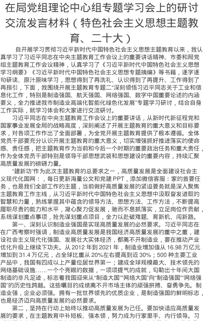 在局党组理论中心组专题学习会上的研讨交流发言材料(特色社会主义思想主题教育、二十大)