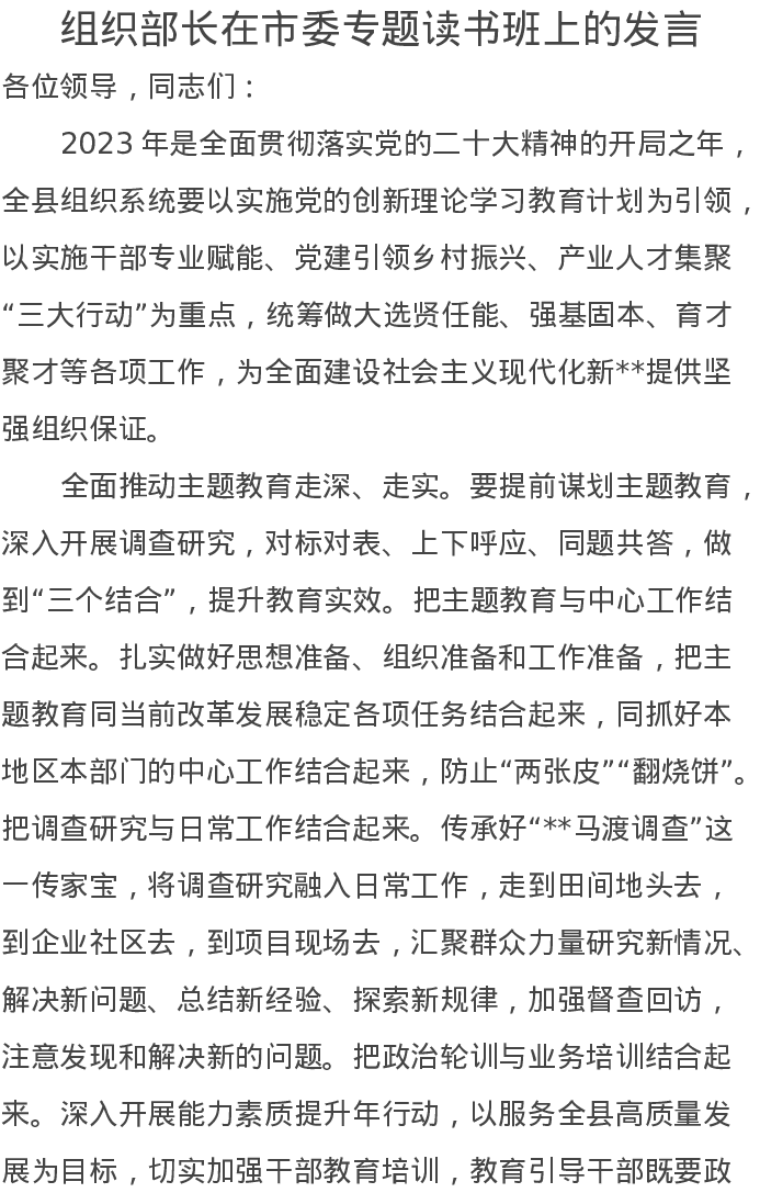 组织部长在市委主题教育读书班上的发言(特色社会主义思想)