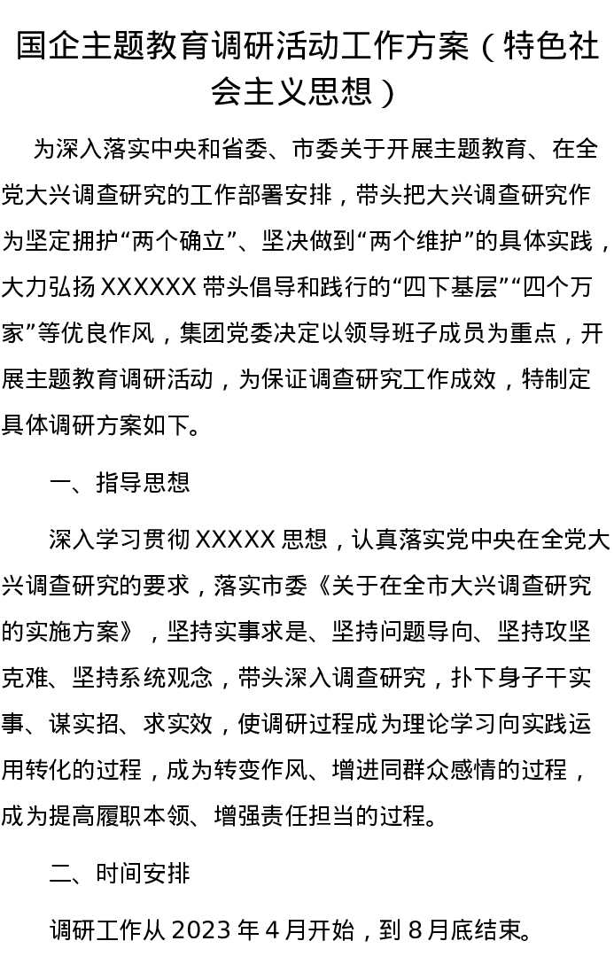 国企主题教育调研活动工作方案(特色社会主义思想)