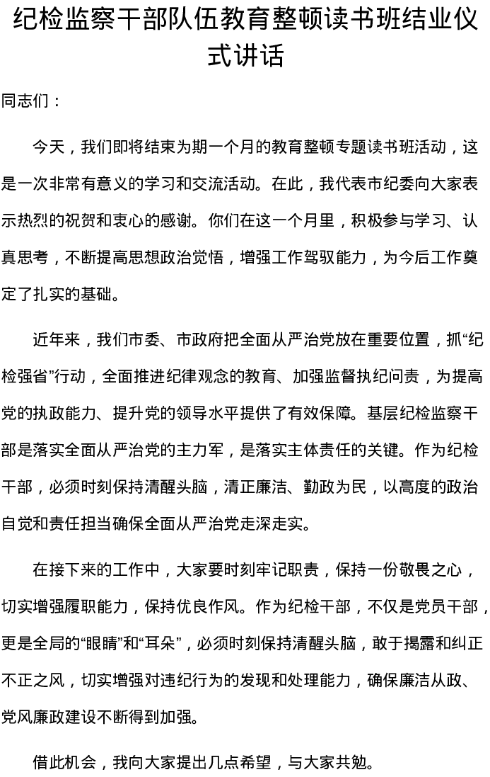 纪检监察干部队伍教育整顿读书班结业仪式讲话
