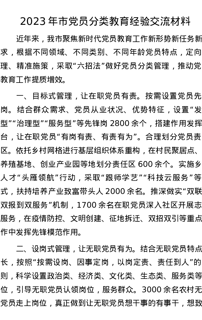 2023年市党员分类教育经验交流材料