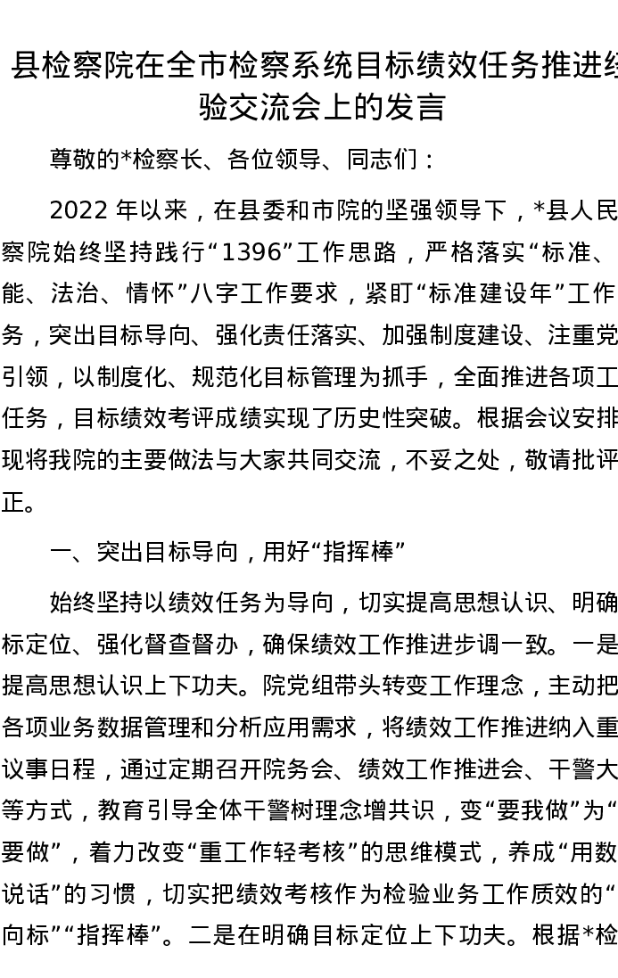 县检察院在全市检察系统目标绩效任务推进经验交流会上的发言