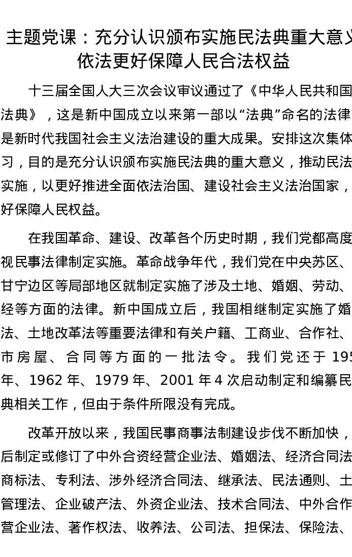 主题党课:充分认识颁布实施民法典重大意义依法更好保障人民合法权益