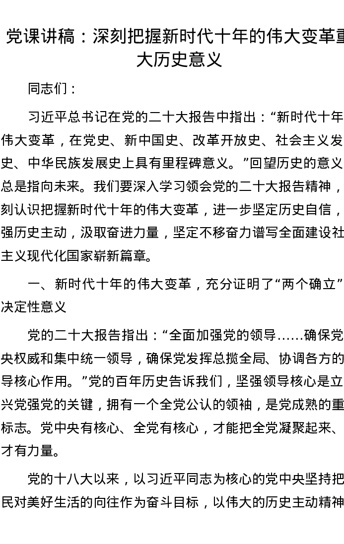 党课讲稿:深刻把握新时代十年的伟大变革重大历史意义