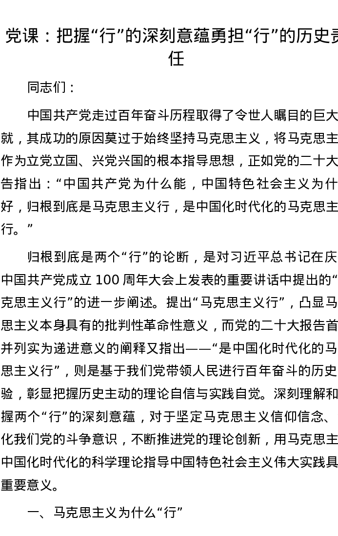 党课:把握“行”的深刻意蕴勇担“行”的历史责任