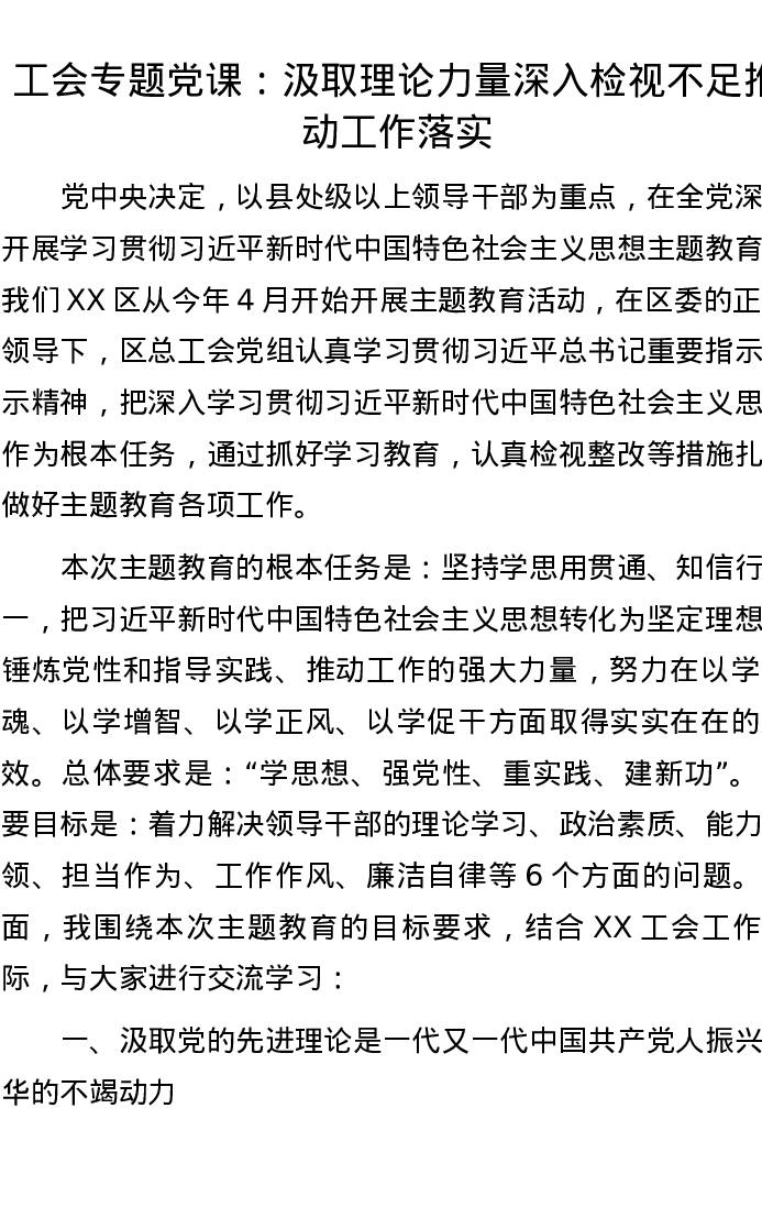 工会专题党课:汲取理论力量 深入检视不足 推动工作落实