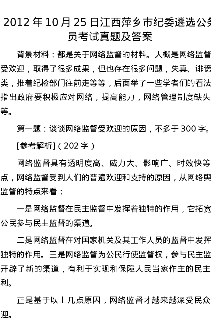 2012年10月25日江西萍乡市纪委遴选公务员考试真题及答案