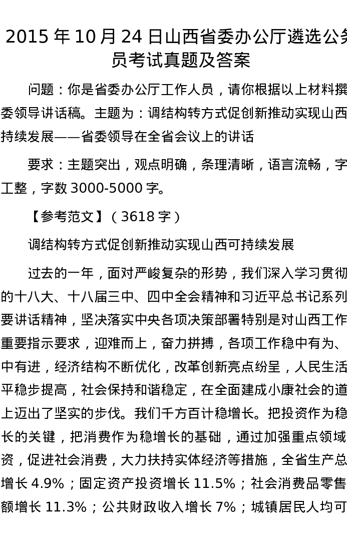 2015年10月24日山西省委办公厅遴选公务员考试真题及答案