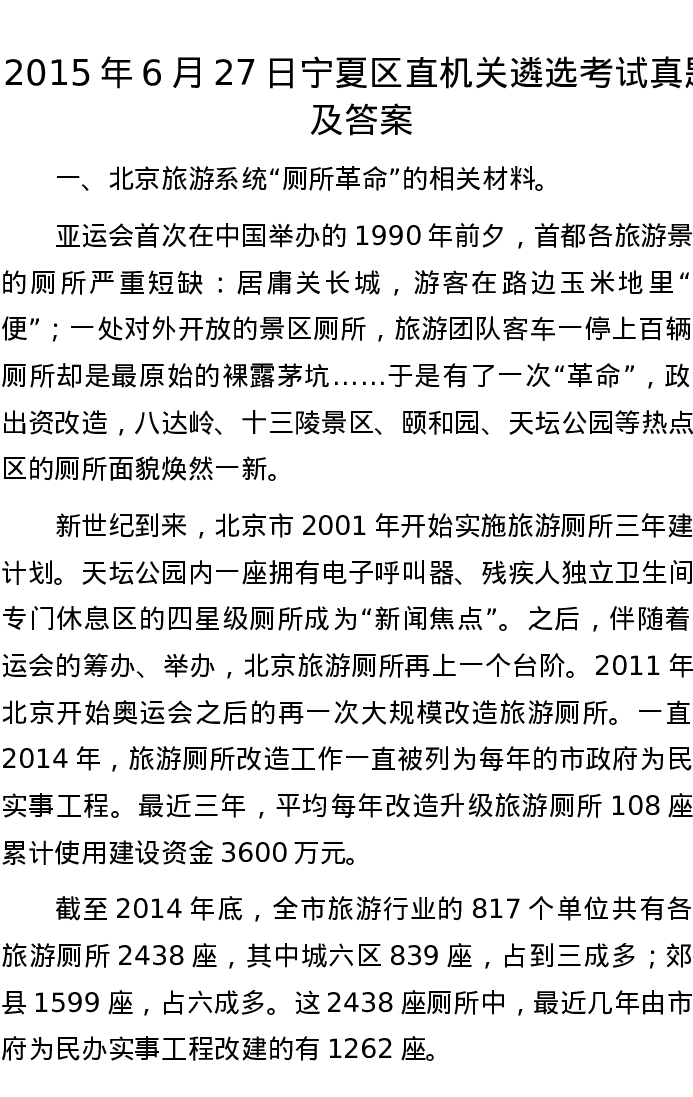2015年6月27日宁夏区直机关遴选考试真题及答案