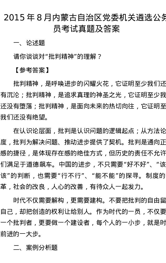 2015年8月内蒙古自治区党委机关遴选公务员考试真题及答案