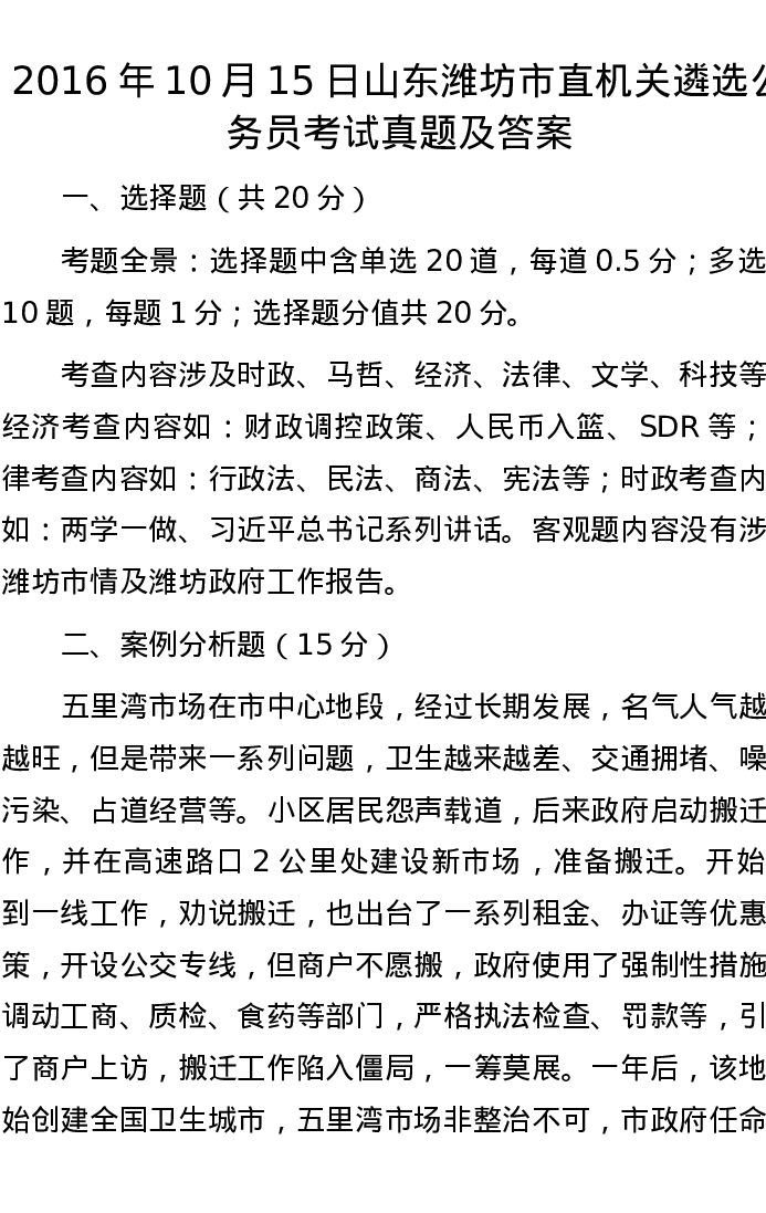 2016年10月15日山东潍坊市直机关遴选公务员考试真题及答案