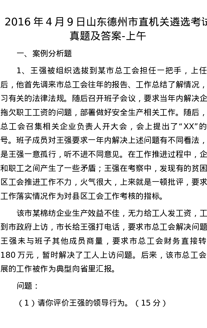 2016年4月9日山东德州市直机关遴选考试真题及答案-上午