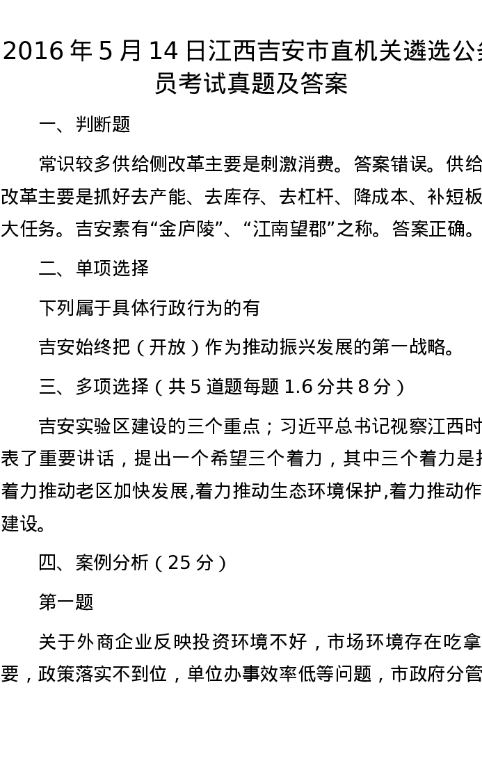 2016年5月14日江西吉安市直机关遴选公务员考试真题及答案