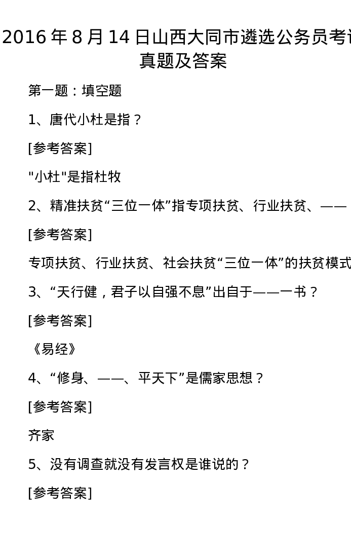 2016年8月14日山西大同市遴选公务员考试真题及答案