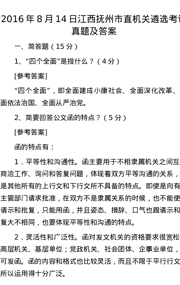 2016年8月14日江西抚州市直机关遴选考试真题及答案