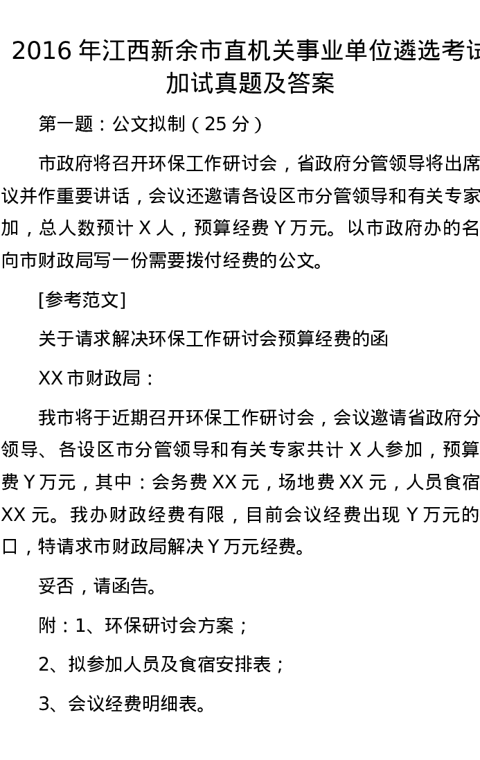 2016年江西新余市直机关事业单位遴选考试加试真题及答案