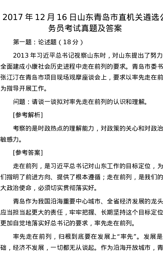 2017年12月16日山东青岛市直机关遴选公务员考试真题及答案