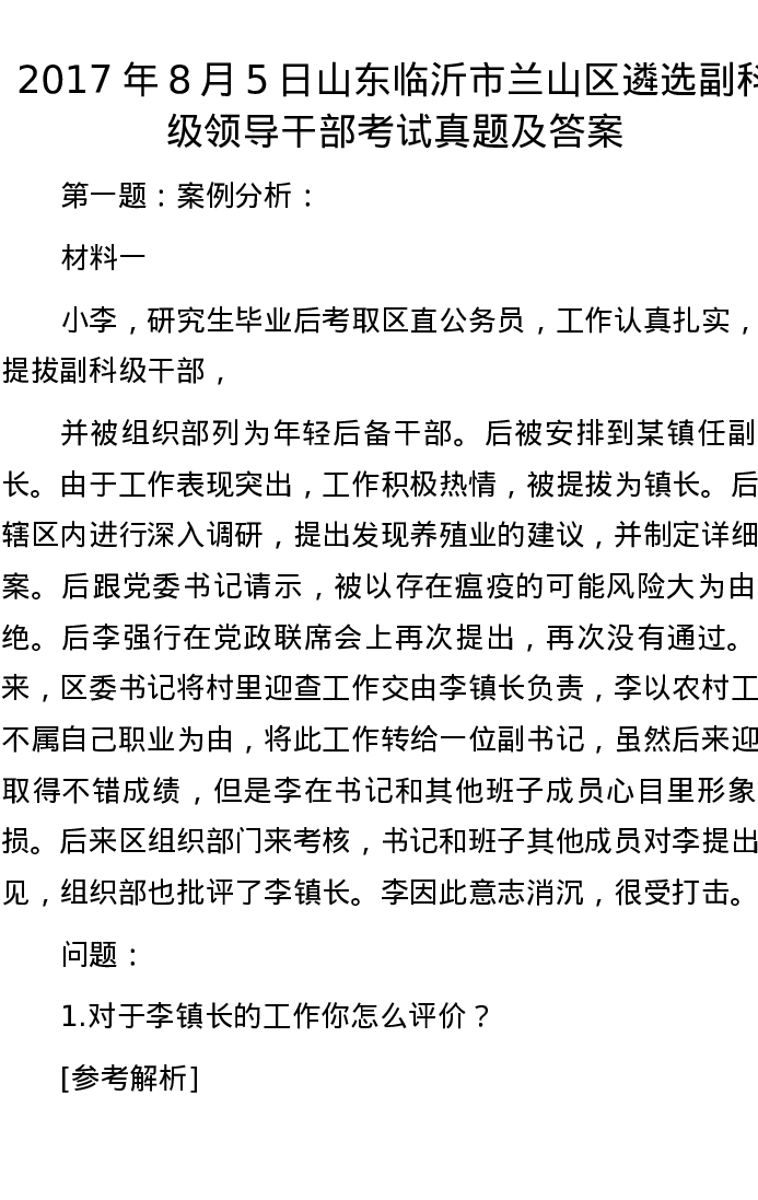 2017年8月5日山东临沂市兰山区遴选副科级领导干部考试真题及答案