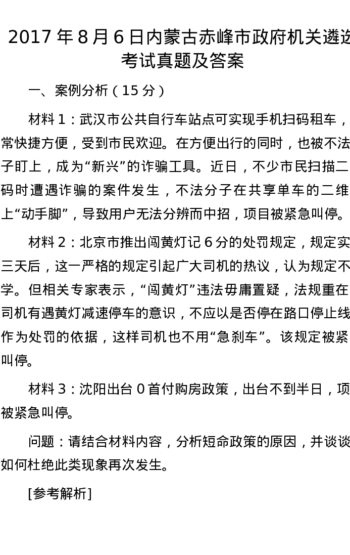 2017年8月6日内蒙古赤峰市政府机关遴选考试真题及答案