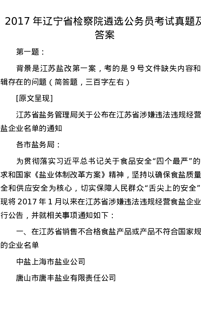 2017年辽宁省检察院遴选公务员考试真题及答案