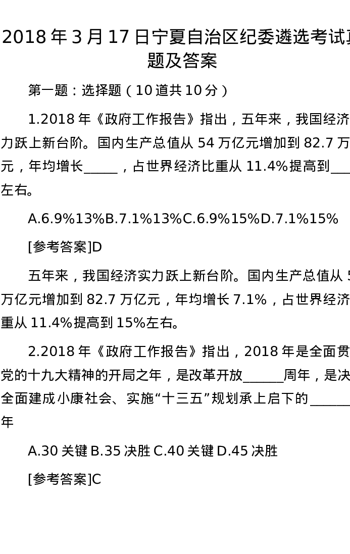 2018年3月17日宁夏自治区纪委遴选考试真题及答案