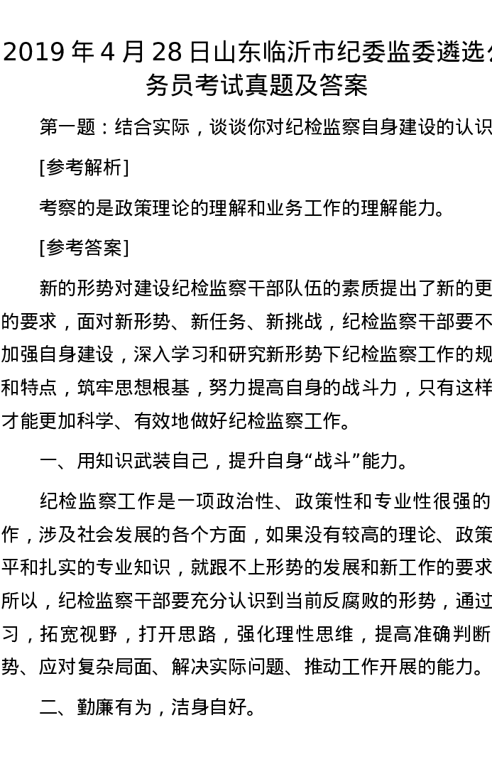 2019年4月28日山东临沂市纪委监委遴选公务员考试真题及答案