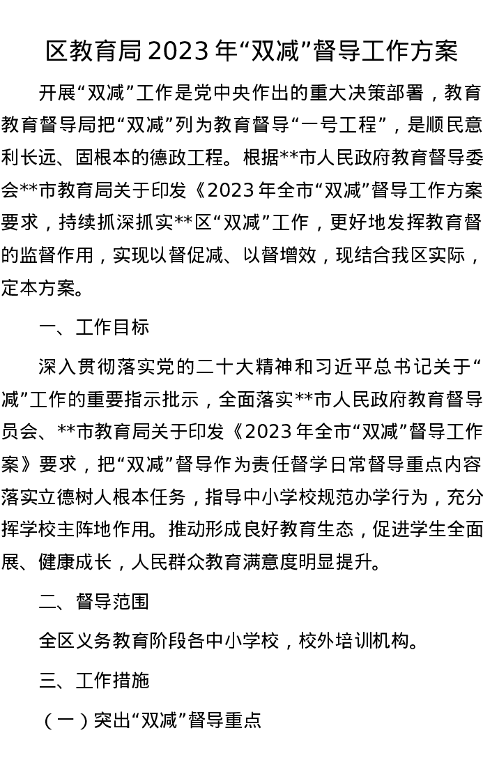 区教育局2023年“双减”督导工作方案