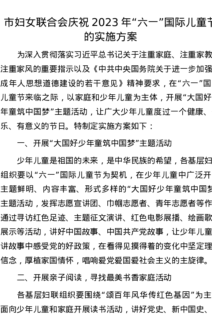 市妇女联合会庆祝2023年“六一”国际儿童节的实施方案