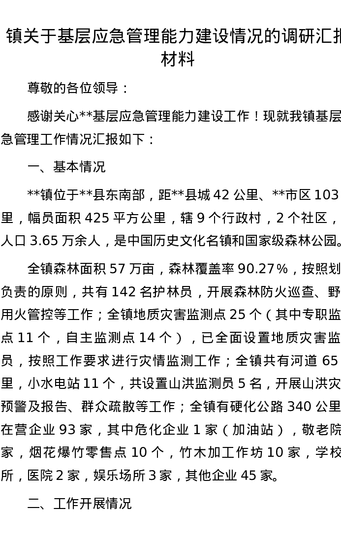 镇关于基层应急管理能力建设情况的调研汇报材料