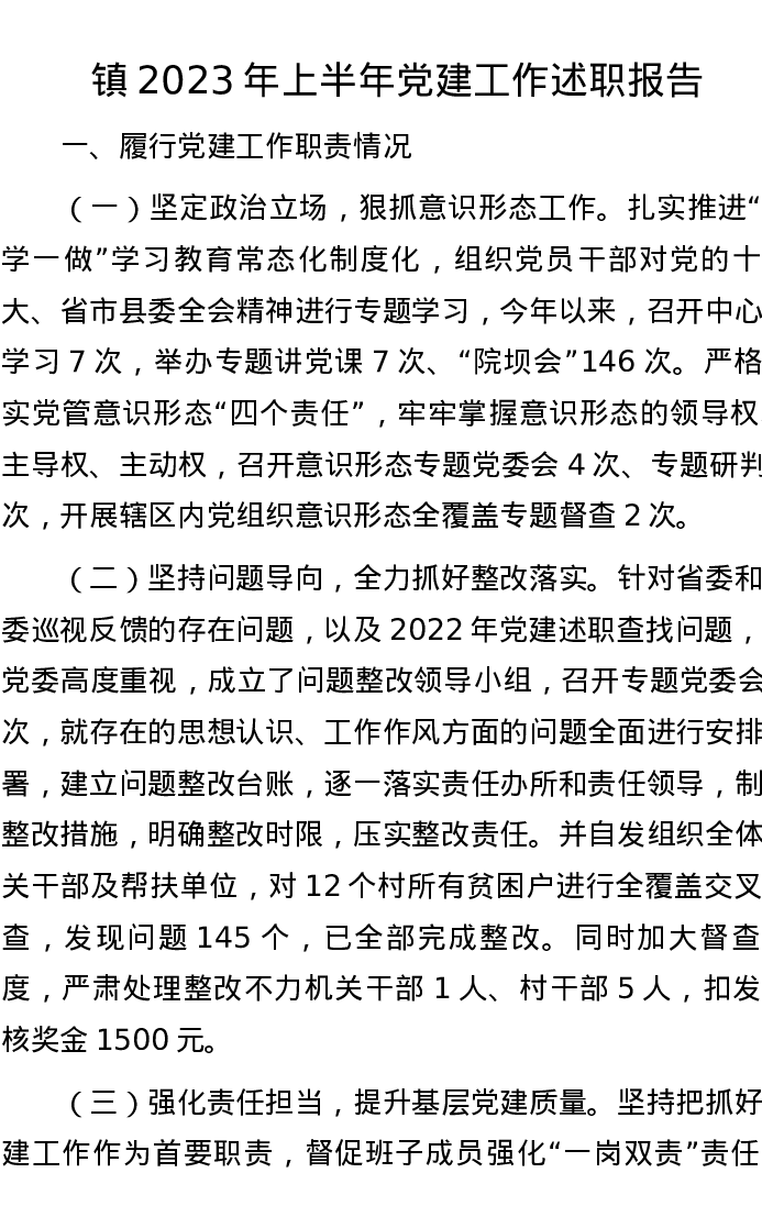 镇2023年上半年党建工作述职报告